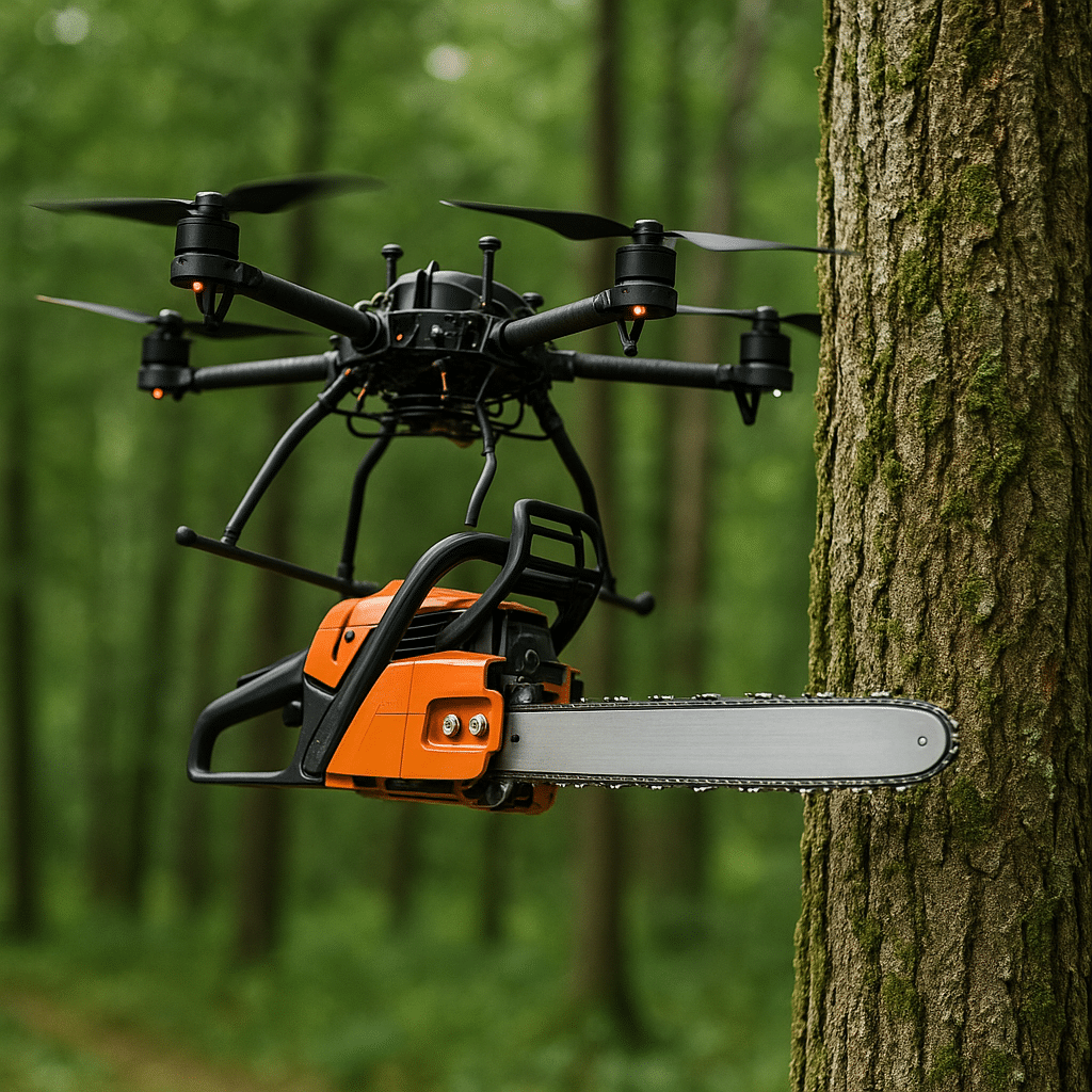 Cette innovation concerne une tronçonneuse électrique sur un drone octocoptère, permettant d'élaguer des branches d'arbres en toute sécurité depuis le sol. Équipé d'un bras articulé et d'un système de contre-poids automatique, ce drone combine agilité et stabilité pour des opérations complexes près des lignes électriques ou en milieux densément foliés. Son système de guidage laser couplé à une intelligence artificielle permet une planification et une exécution automatisée des coupes. Il intègre, également des capteurs anti-collision et un système de transmission redondant pour une fiabilité opérationnelle en milieu complexe.